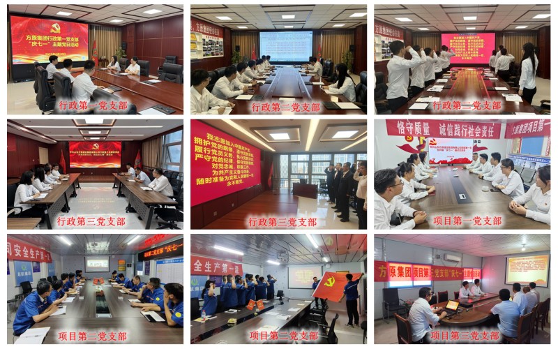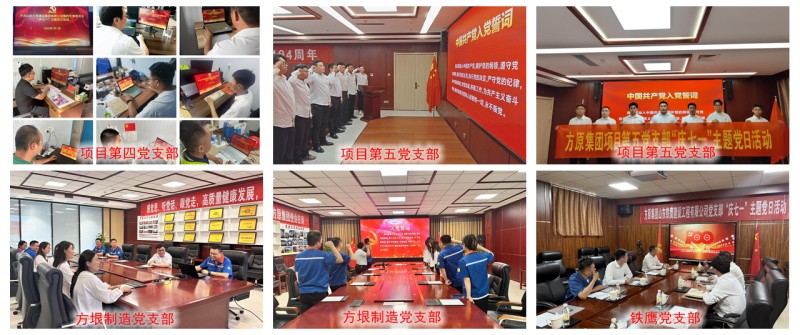 行政第一党支部、行政第二党支部、行政第三党支部、项目第一党支部、项目第二党支部、项目第三党支部、项目第四党支部(线上开展)、项目第五党支部、方垠制造党支部、铁鹰党支部围绕“庆祝党的生日,我该怎么做”、“立足岗位作贡献”、“党建+项目”和“党业深度融合”等主题组织开展专题座谈会进行深入研讨,认真组织党员学习习近平总书记重要讲话精神、讲授专题党课、深入学习研讨企业文化,并集体重温入党誓词等。