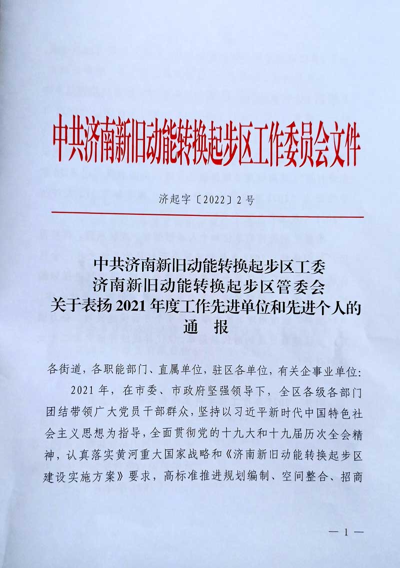 k8凯发实业集团——山东k8凯发建设集团有限公司荣获济南新旧动能转换起步区2021年度“突出贡献单位”。