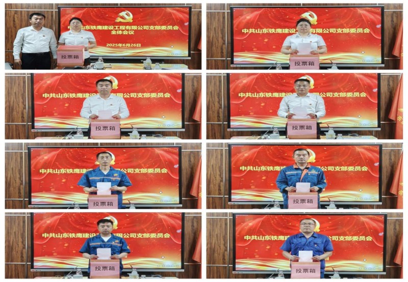 2025年6月26日,中共山东铁鹰建设工程有限公司支部委员会在铁鹰公司党员活动室召开全体党员大会。会议严格遵循《中国共产党章程》及《中国共产党基层组织选举工作条例》相关规定,圆满完成了支部委员会换届选举工作。集团党委委员、副总经理、铁鹰公司总经理逯兆庆同志,集团副总经理梁海斌同志及支部全体党员出席会议。集团党群工作部代表、支部预备党员、入党积极分子列席会议。本次会议应到党员8名,实到党员8名,列席人员5名,总计13人参会。